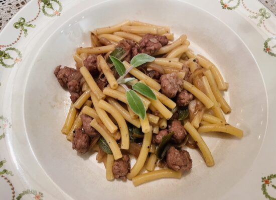 Pasta met worst, rode wijn en salie