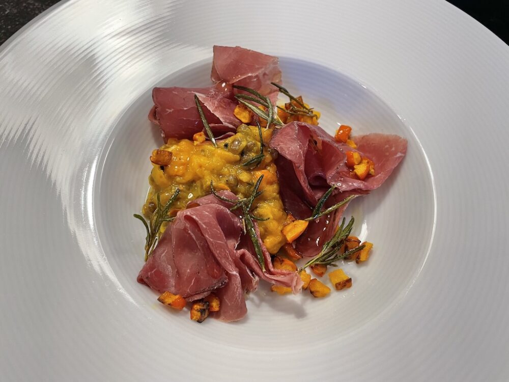 Meng de linzen met de pompoenmoes. Controleer op smaak en voeg zo nodig en zonder te veel aarzeling zout en peper toe. Leg op elk van 4 diepe bordjes een hoopje van het mengsel en schik er drie plakken nagelholt in rozetten eromheen. Garneer met de rozemarijn en besprenkel met de rozemarijnolie. Daar hoort uiteraard wijn bij. Uit de Achterhoek de cuvée barrique van Wijngoed Hesseling, of anders gewoon een houtgerijpte witte Mâcon.