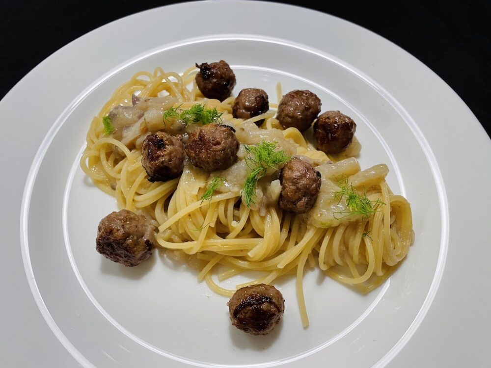 Spaghetti met venkelsaus en kruidige gehaktknikkertjes