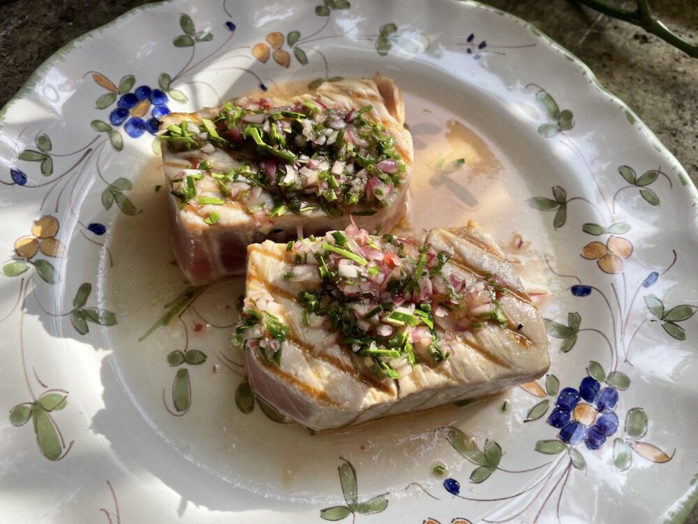 Dep de tonijn droog met keukenpapier en smeer hem in met olijfolie. Verhit een grillpan en gril er de vis in, maar erg kort, zeg 1 minuut per kant. De binnenkant moet zo rood blijven als een saignante biefstuk. Serveer meteen met de saus. Erbij: gebakken aardappeltjes en lichte rode wijn, die je een uurtje in de deur van de koelkast hebt gezet. Ik neem spätburgunder.